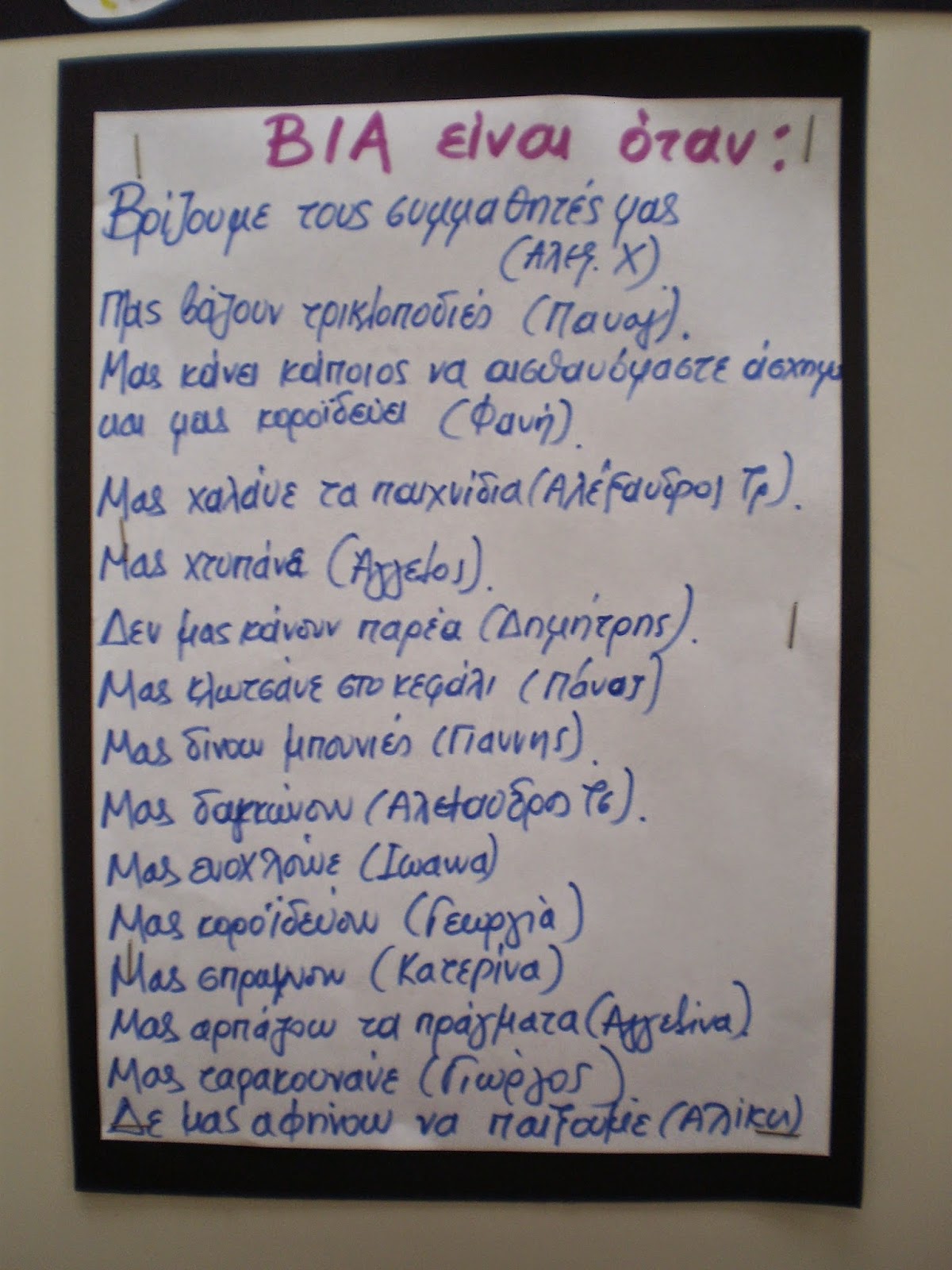 Την 6η Μαρτίου ημέρα κατά της ενδοσχολικής βίας μας άγγιξε ένα βίντεο που είδαμε στον υπολογιστή και κάναμε από μια αφίσα κλασσικό και ολοήμερο εκφράζοντας τα συναισθήματά μας.